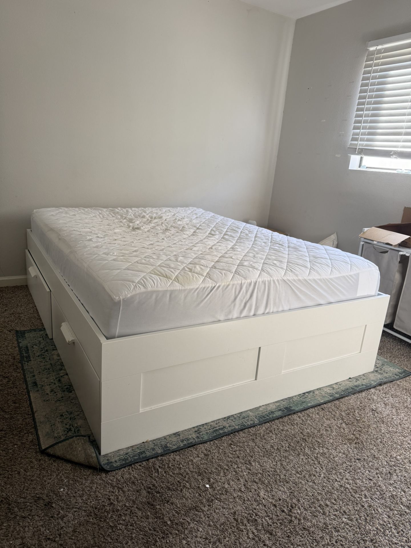 Modern, functional white storage bed frame with 4 spacious drawers (2 on each side). Perfect for maximizing bedroom storage — ideal for clothes, bedding, or extra linens. • Condition: Great overall — sturdy and clean. One drawer handle has light wear on the corner from a dog (see photo), but otherwise in excellent shape. • Material/Color: White laminate finish • Storage: 4 large pull-out drawers with smooth glide • Mattress Size: Fits a standard Queen, depending on mattress depth • Includes: Bed frame only (mattress not included) • Dimensions (approx.): 78” L × 57” W × 18” H (Drawers are 36.5” L x 10.5” W x 7” H This bed is solid and provides a ton of hidden storage — perfect for apartments or smaller rooms. * PICKUP ONLY AND MUST BE ABLE TO DISSEMBLE (because I have no idea how to take it apart besides the drawers)