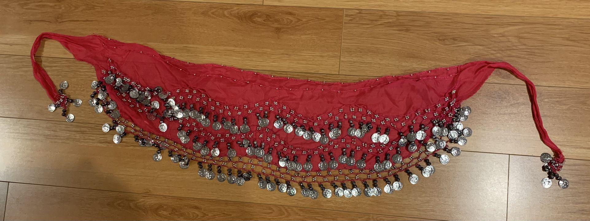 Belt is in Great condition. It ready to be tied around your waist for dance/exercise. Lots of “silver coins” that jingle!