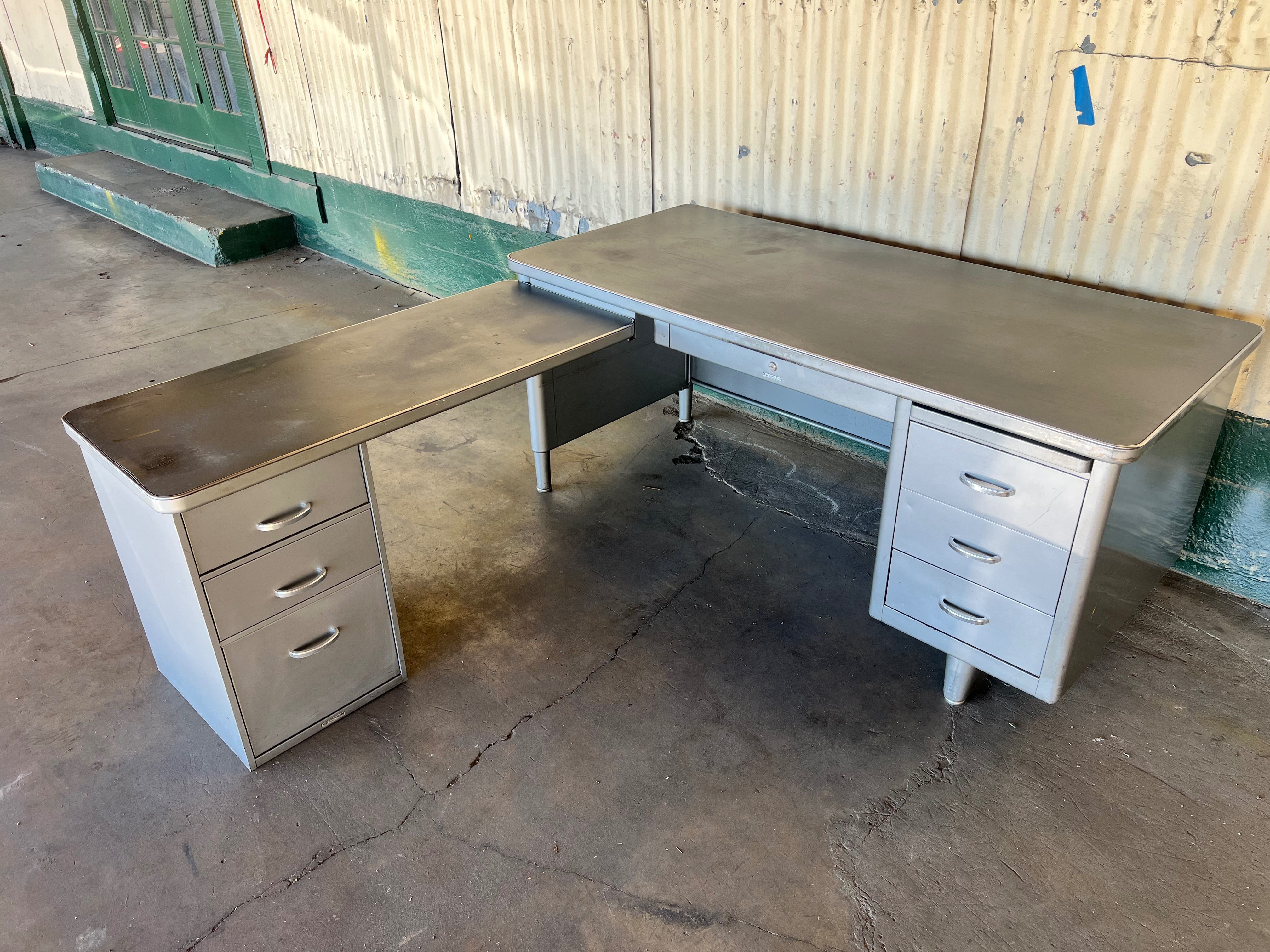 Hello. Please read completely* We have a vintage L shape Tanker desk circa 1950’s. This is a silver colored desk with a grey top. The table top on the return has a crack on it (see pic) other than that the whole Desk is in sharp shape considering its age. All drawers open and close just fine. This is easily a rare piece not easy to find. HURRY, FIRST COME FIRST SERVE!!! We are selling this L shape Tanker desk for $699. Please message me to schedule a pick up or to deliver (for a charge) Thank you James Desks office chairs vintage furniture used office furniture flat files lockers file cabinets conference table knoll Eames retro antique vintage chairs