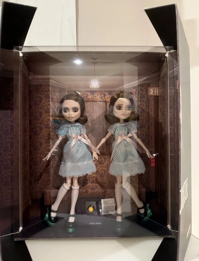 Monster High Skullector The Shining Grady Twins 45th Anniversary Mattel Product Description Inspired by The Shining, this 2-doll set reimagines the iconic Grady Twins through a Monster High twist. Each wears a blue lace-trimmed dress with sheer sleeves, stockings, and maze-themed Mary Janes. Includes hatchet hair clips, Room 237 key, yellow ball, and Jack’s manuscript page. Dolls stand 10" tall with 11 points of articulation. Comes in collector packaging recreating the hotel hallway scene, featuring the “Second Release” sticker and a Certificate of Authenticity.