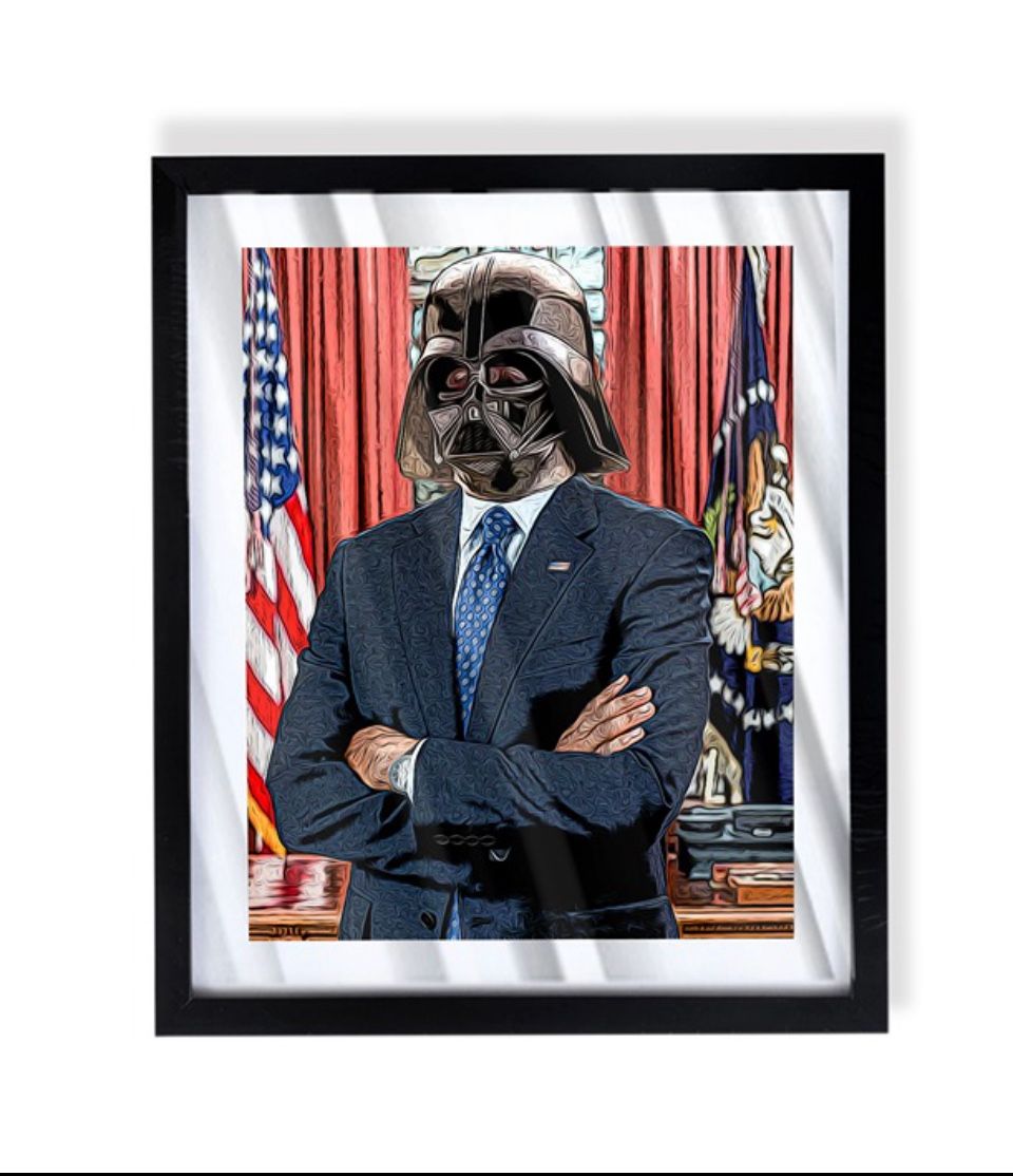 This striking 12x10 black-framed print reimagines Darth Vader as President of the Galaxy, dressed in a sharp suit and standing in the iconic Oval Office. A powerful blend of Star Wars and political satire—perfect for fans who like their art with a twist of dark humor and authority. Also available: 1 of 1 24x36 canvas, plus larger print sizes. Bundle to save on shipping and get a better deal!