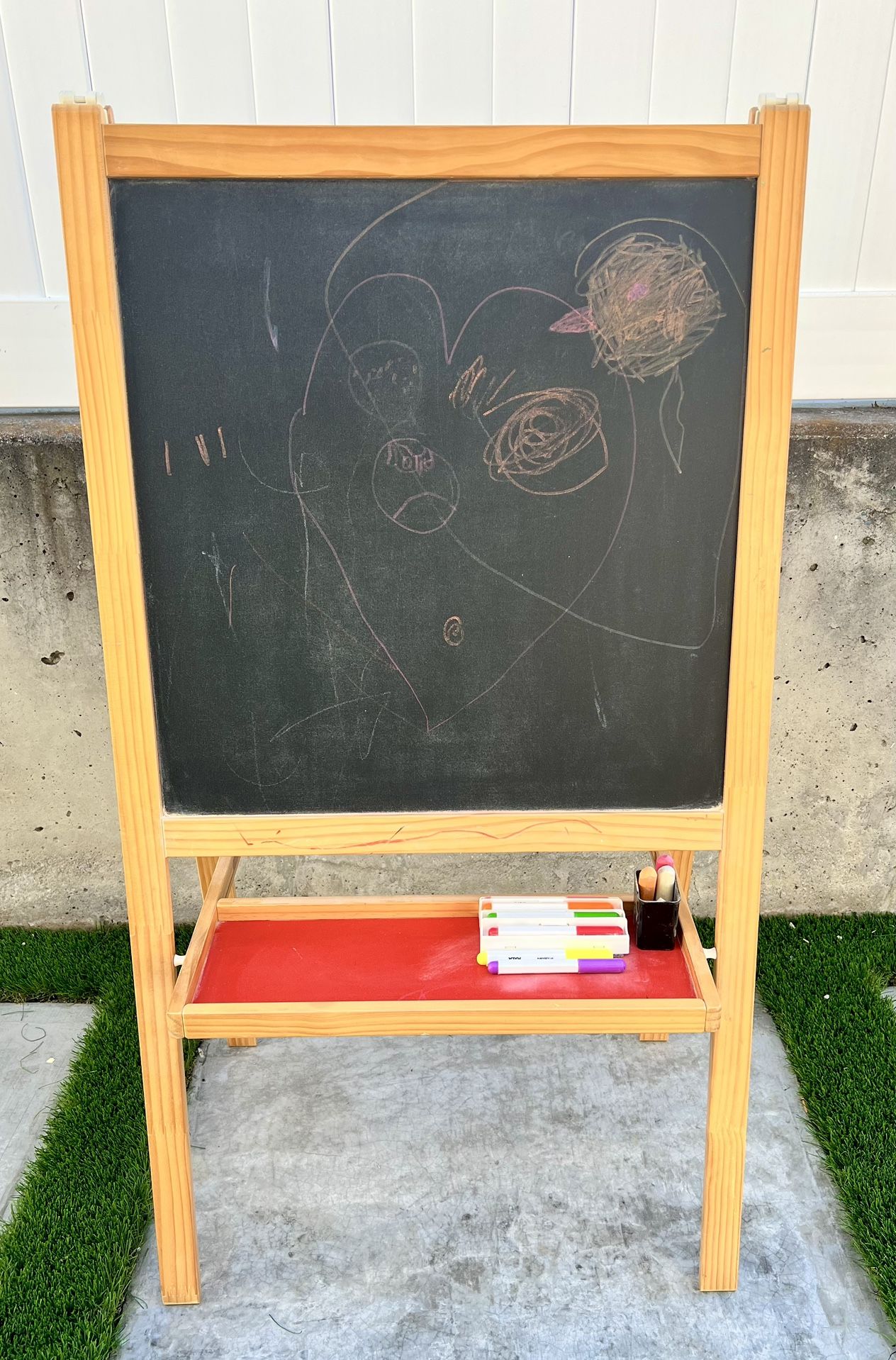 Dry erase and chalk easel in good condition. Framework in perfect condition. Faint Reminence on chalk side noted… See picture. Comes with markers and chalk. 46” tall x 24” wide x 16” deep at base. Pick up referred. I’m located in Santee.