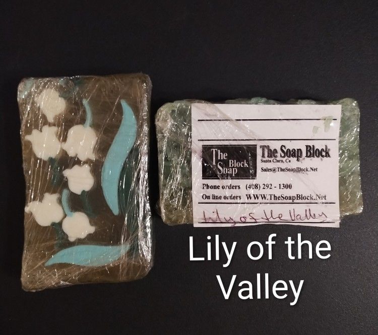 The Soap Block, Lily of the Valley, is a soft floral scent. You can easily cut this one up into small bars and use as guest soaps. All soaps are a glycerin type made from coconut oil. They have a nice creamy lather, will scent your whole bathroom, and look beautiful. You can safely use it on even the most sensitive skin with no problems. Soap Block soaps are hypoallergenic, nut free, gluten free, and soy free. Size Approx. 4” x 3”x.75” Weight Approx. 5.5oz - 6.5oz The bar with the Lily of the Valley flowers has no name brand or label. Asking $5 each (retail $7) Located in Stallion Mountain Golf Community, East Flamingo Rd