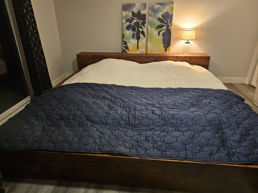 Great condition, no scratches or knicks. For sale online (new) for $5,300. https://offerup.co/faYXKzQFnY?$deeplink_path=/redirect/ The Hudson Platform Bed is intended to imitate the scale and presence of large stacks of natural lumber. The rough reclaimed surface of the material is removed to reveal a beautiful old growth grain hiding below. The wood is then carefully placed on the beams in a patchwork pattern. The bed’s low profile counterbalances the rustic, reclaimed materials with a simplistic, modern design. The mattress sinks into the frame, preserving the modern aesthetic. The wide beam sideboards create excess surface area for bedside items, allowing you to forgo traditional nightstands. OBO