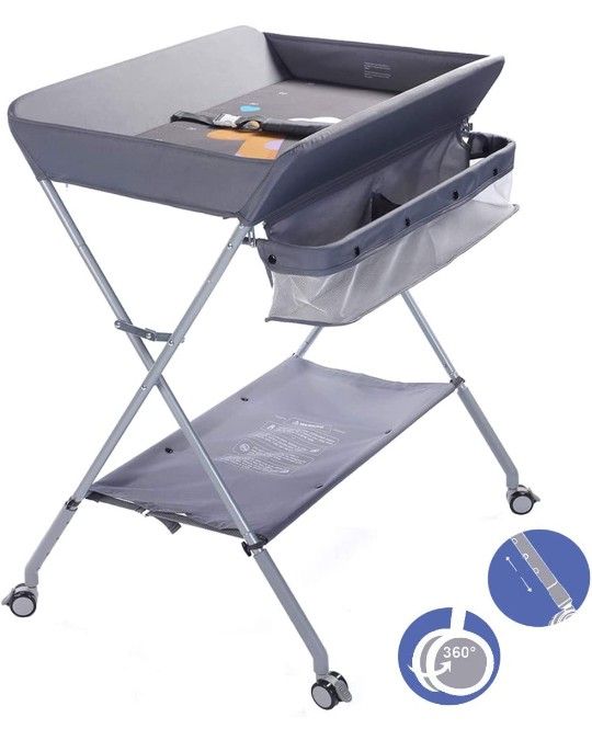 EGREE Baby Changing Table Portable Folding Diaper Changing Station with Wheels, Adjustable Height Mobile Nursery Organizer with Safety Belt and Large Storage Racks for Newborn Baby and Infant, Gray