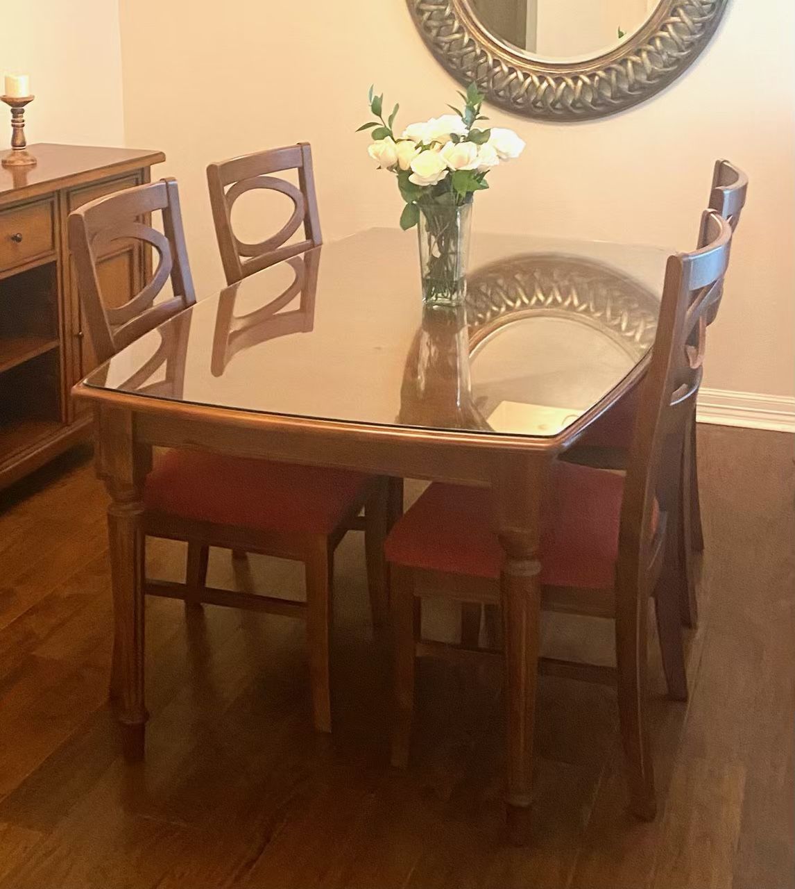 Solid wood table and 4 matching chairs with cloth seats in good shape. Includes 1/4” tempered beveled glass that fits shape of table top, as well as additional leaf.