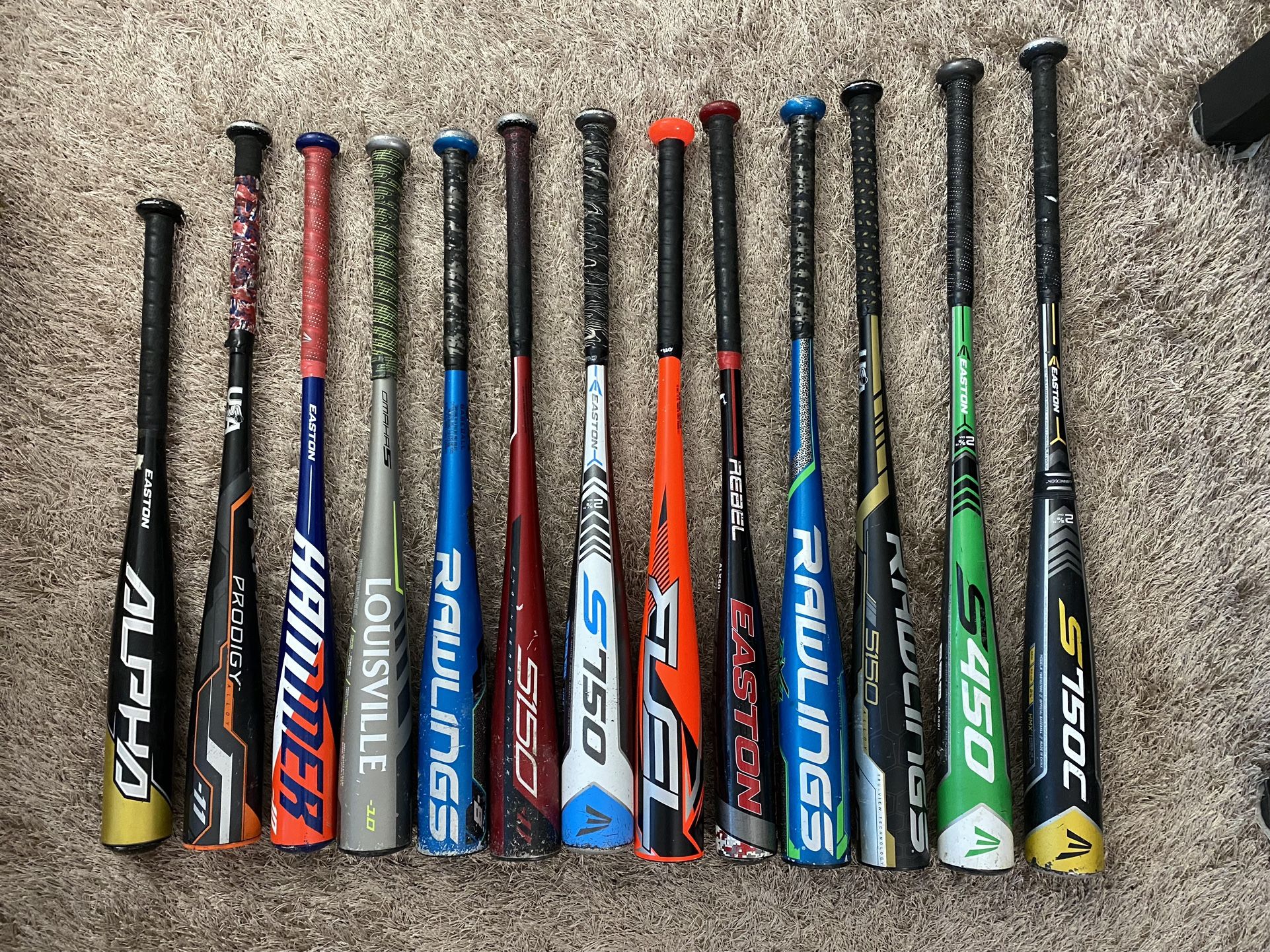 These are listed as pictured left to right. To get the weight you just subtract the Drop from the Length. 24”/14 oz Easton Alpha; 2 1/4” barrel 27”/16 oz Rawlings Prodigy 27”/17 oz Easton Hammer; 2 1/4” barrel 27”/17 oz Louisville Omaha $40 27”/19 oz Rawlings RX4 28”/17 oz Rawlings 5150 28”/18 oz Easton S750 28”/20 oz Rawling Fuel $40 29”/19 oz Easton Rebel; 2 1/4” barrel 29”/21 oz Rawlings RX4 30”/20 oz Rawlings 5150 $40 31”/23 oz Easton S450 SOLD 32”/22 oz Easton S750, 2 piece, $50
