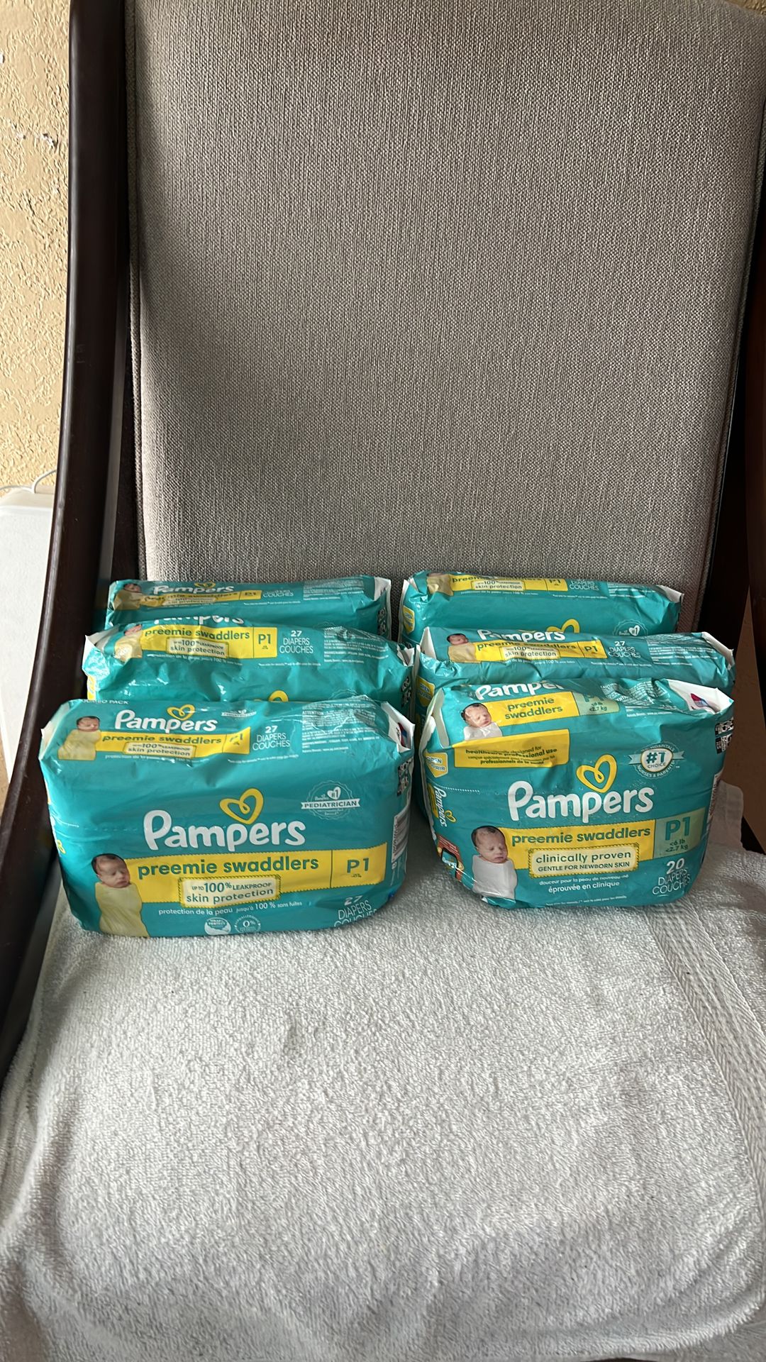 Diapers for preemie babies 6 packs, never open 5 are 27 per pack 1 is 20 per pack Size P1