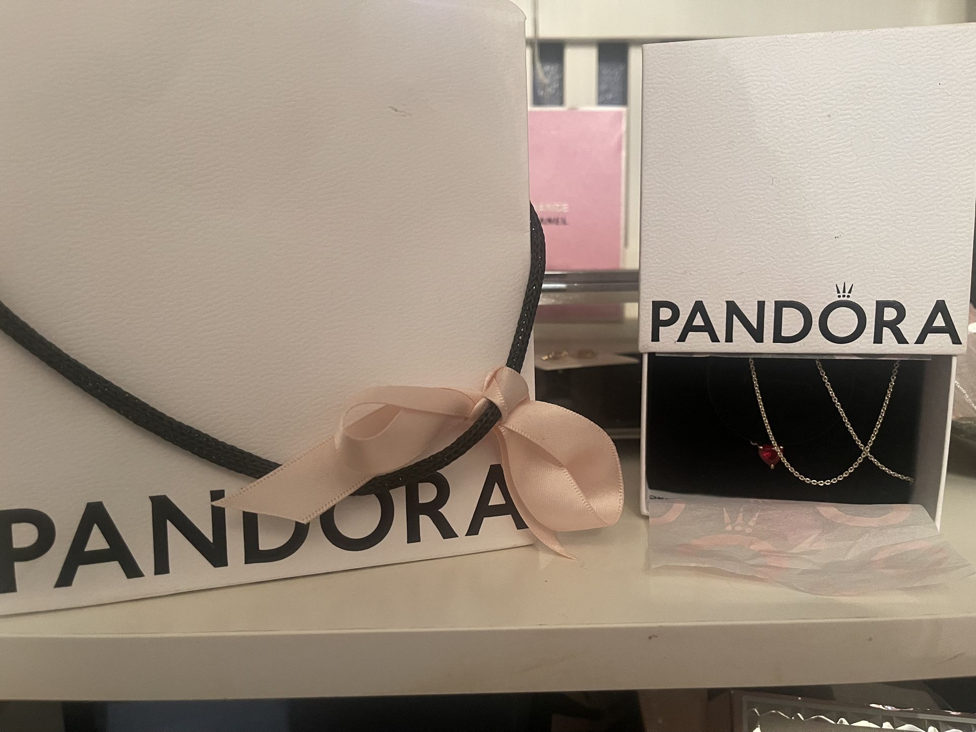 This beautiful pandora red heart necklace is 17.7 inches. I owned it for 5 months and worned a few times. Comes with box and package, setting price at $50.