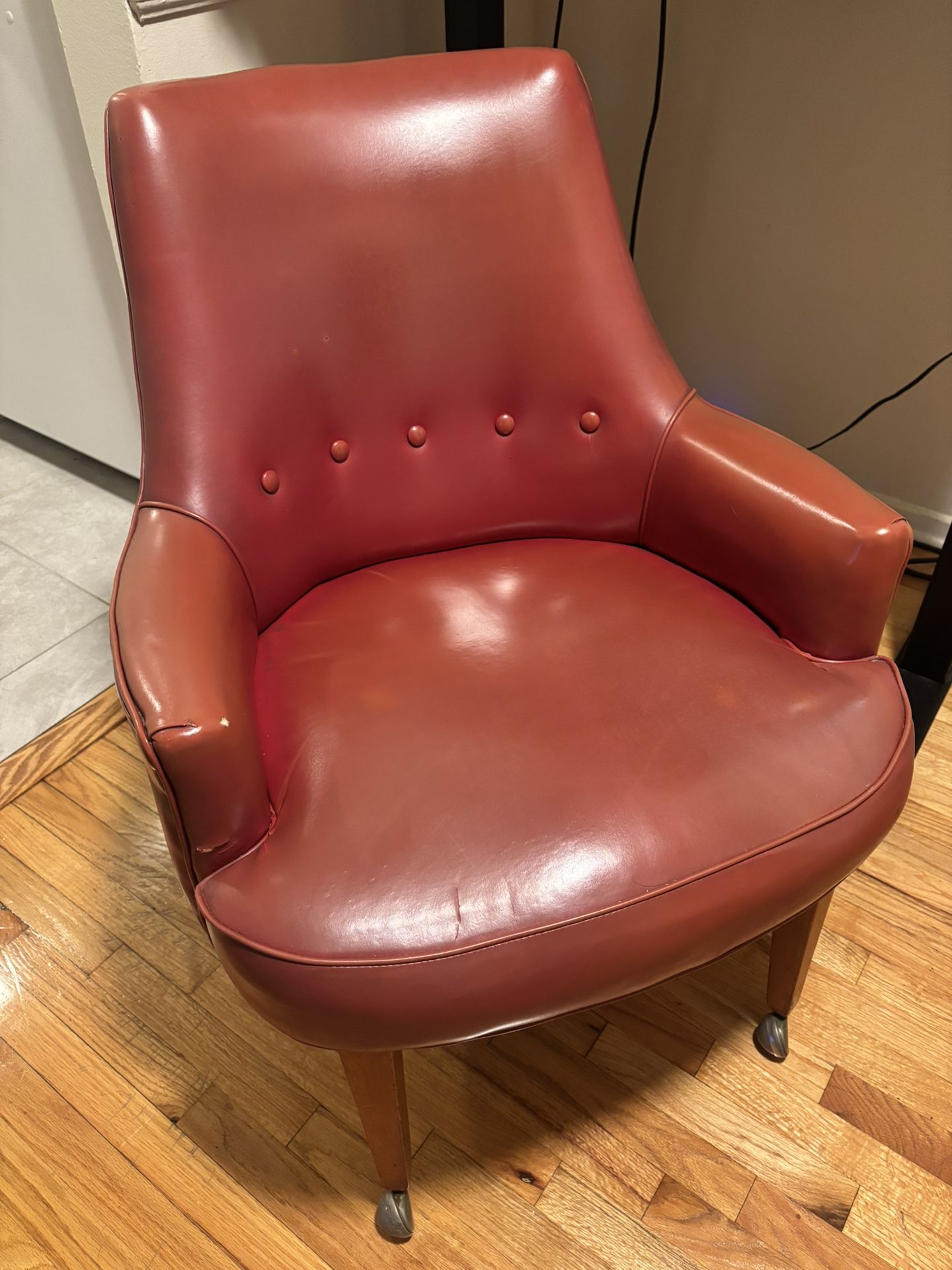 Vintage banker chair Red, leather One wheel is broken but still totally functional Comfortable and good for office use