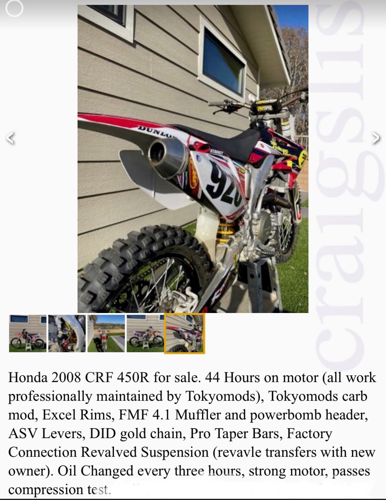 Honda crf 450r lots of aftermarket parts Low hrs ..$4000 or trade for vehicle