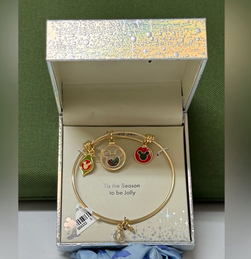 Disney "Tis the Season to be Jolly" Mickey Mouse Christmas Holiday Bangle Bracelet. It is a gold-toned, stainless steel bangle with Christmas-themed Mickey Mouse charms. The charms include two Mickey Mouse Christmas ornament charms and one clear crystal ball charm. The bracelet and charms are part of the Disney Holiday Collection. New with tags and comes in its original packaging.