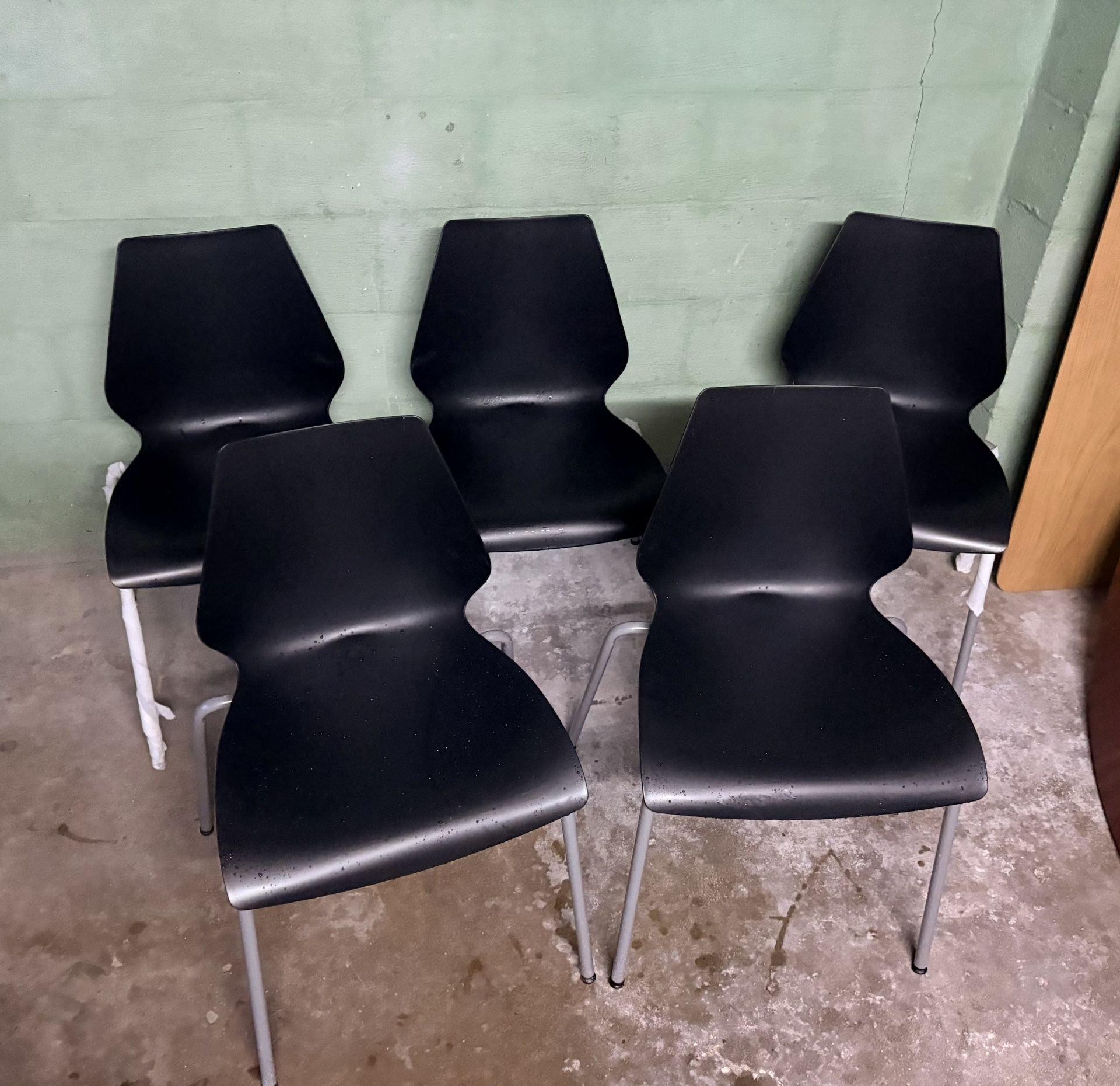 Set of 5 kitchen dining chairs, plastic with metal legs. New