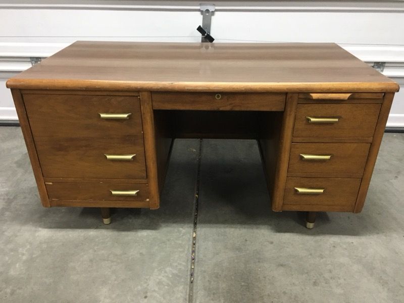 Jasper Office Furniture Company Jofco Mid Century Modern 6 Drawer Office Work Desk Approx. 58” x 31” x 29 1/2” tall Has a sturdy slide out shelf on the left side, should be a really nice spot to conceal a printer, was probably a storage shelf for typewriter. Real wood, no particleboard here. Made in Indiana, USA.