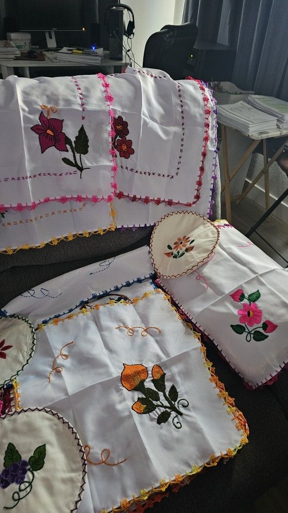 Servilletas bordadas a mano 50×50 cm diferentes estilos. Tambien cuento con servilletas redondas y mandiles