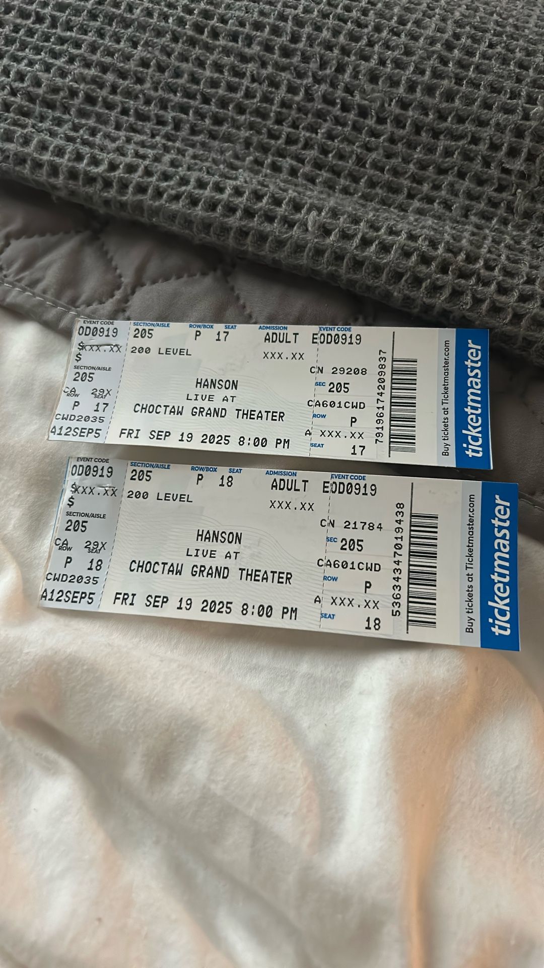 2 tickets to see HANSON Live at Choctaw grand theater on Friday September 19th at 8:00 p.m anyone interested send me a message.