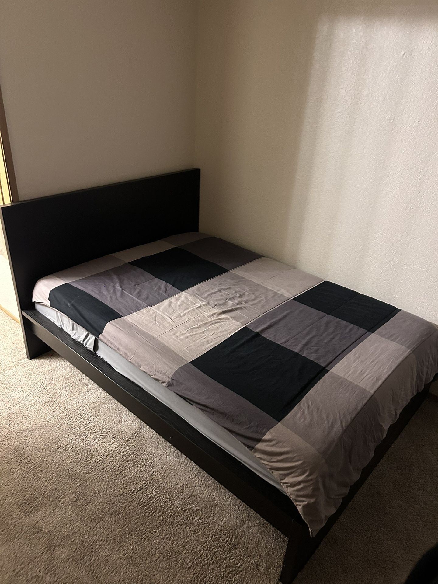 BEDFRAME ONLY Sleek black bed frame in great condition with a solid headboard and sturdy construction. Modern, minimal design that fits easily with any bedroom style. No squeaks, no damage, and well taken care of. Easy to assemble and ready for pickup.