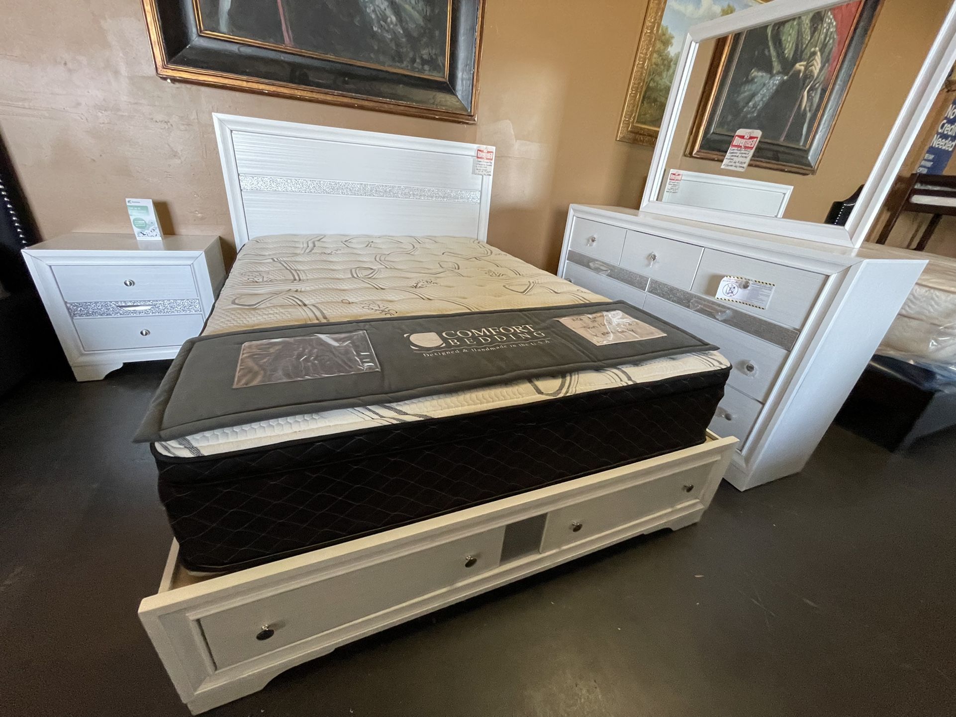 Brand new bedroom set including Queen Storage bed dresser mirror and nightstand
