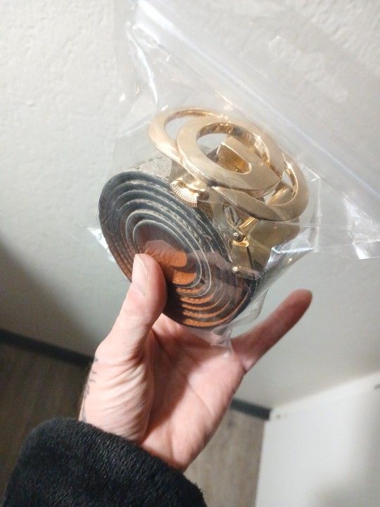 The buckle is golden and resembles Gucci, the belt itself is genuine leather and is a golden brown. It's adjustable and looks really nice. A company sent it too me to wear in a video but I asked for a white and silver one and got this instead. I'm only asking 20$ for it