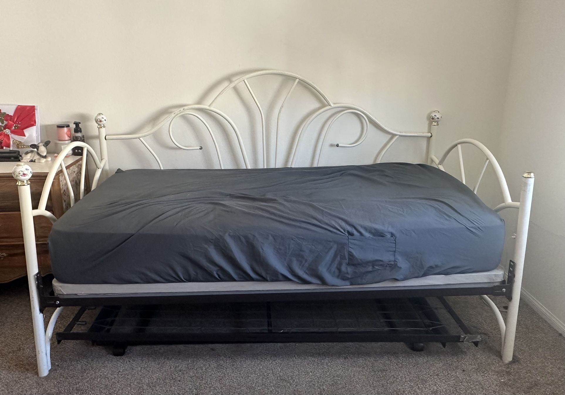 This is a full girls bedroom furniture set. All items are antique. It has a twin size day bed with an extension that can be pulled out and attached to create a queen bed. The one mattress is included. It has two 3 draw dress, a night stand, and a vanity with two draws and a chair included.