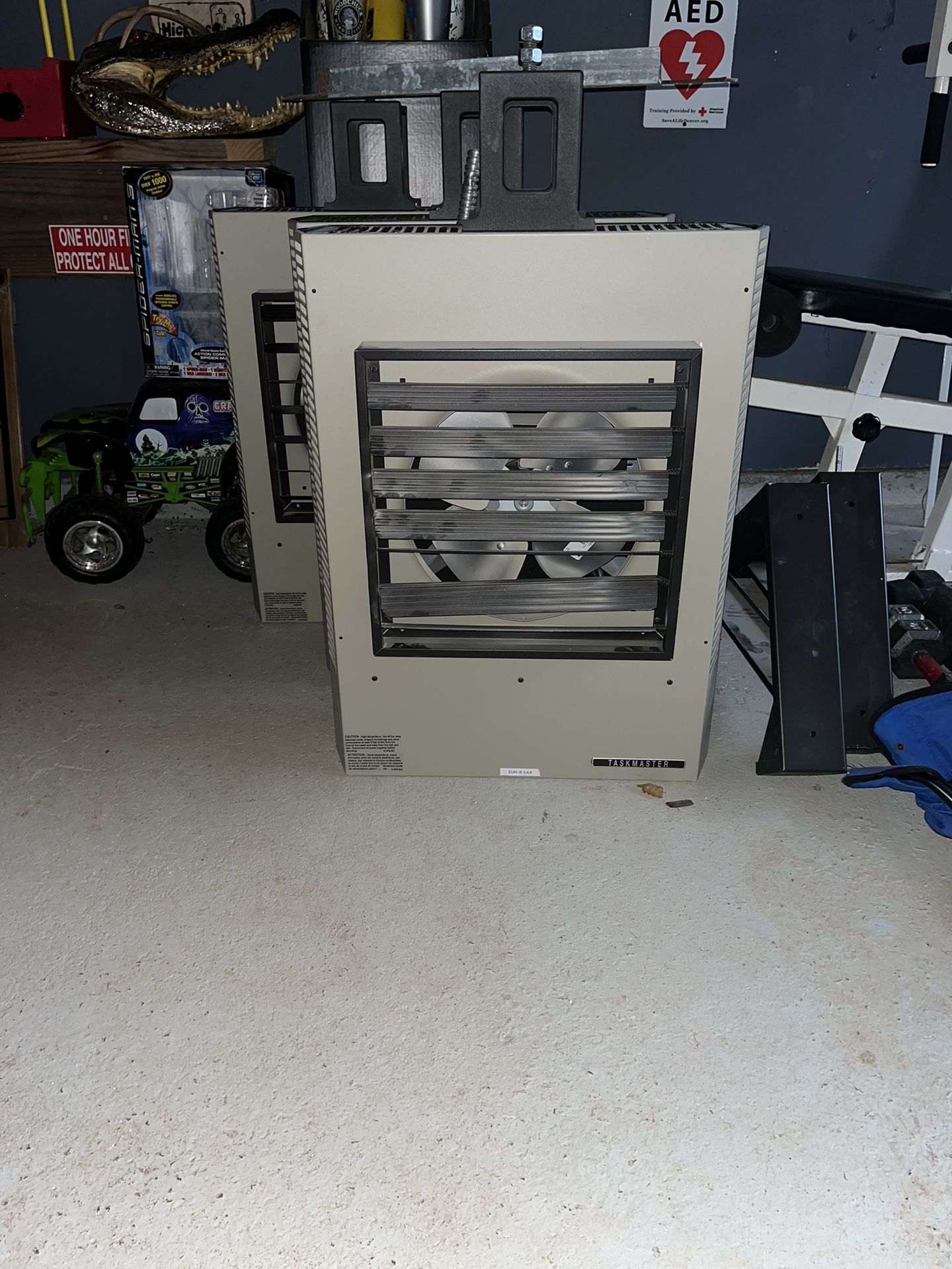 Hanging electric heater, with built in disconnect and temp control. Brand new, this heater was hung and never turned on. Willing to trade