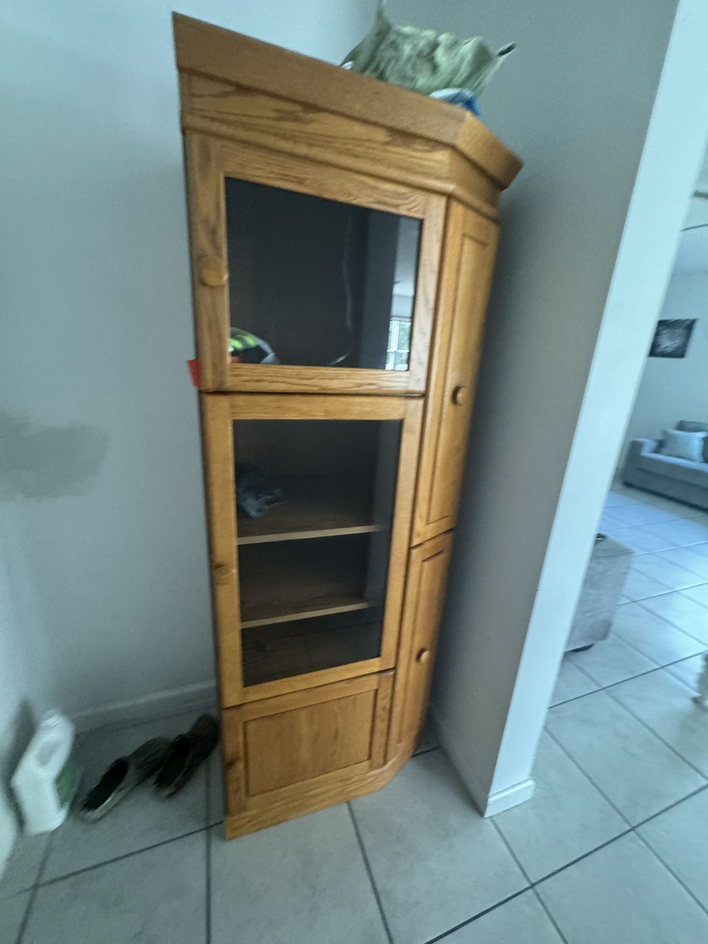 2 Solid oak corner curio cabinet with glass doors and shelves