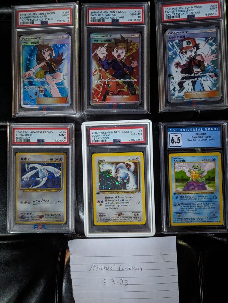 Have some pokemon slabs for sale. Squirtle - 50 GB Lugia - 325 1st ed neo Lugia - 1200 Reds challenge - 160 Blues tactics - 250 Greens exploration - 600 All are OBO.