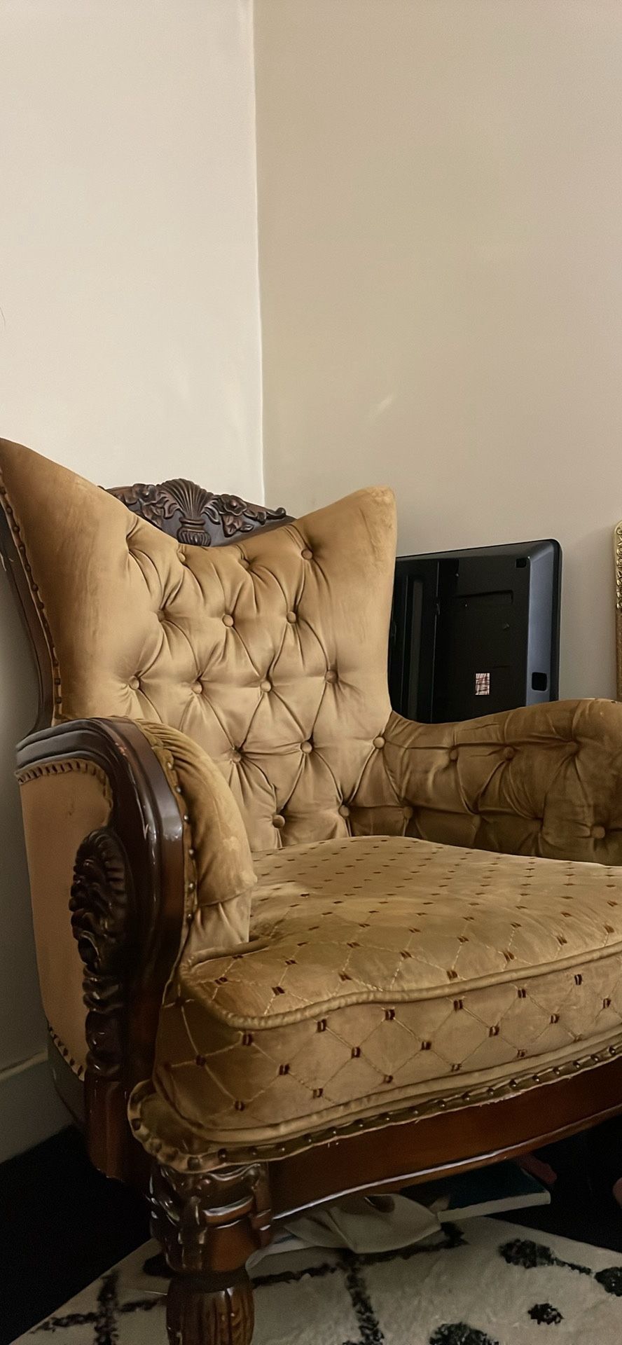 Non-smoker, no pets hand carved wood velvet fabric, golden chair