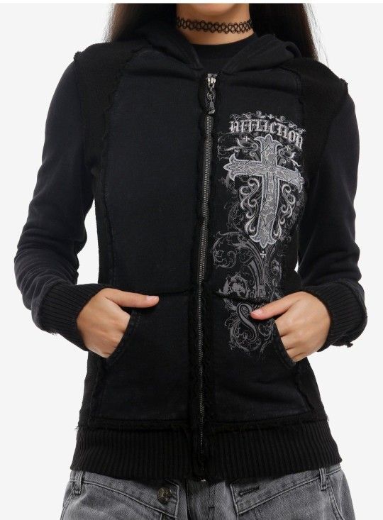 Zip-up with this edgy Affliction hoodie! It's black and features grey crosses and filigree printed on the front and back. Designed with raw edge detailing on the shoulders, seams and hem. Comes with a hood and front pockets