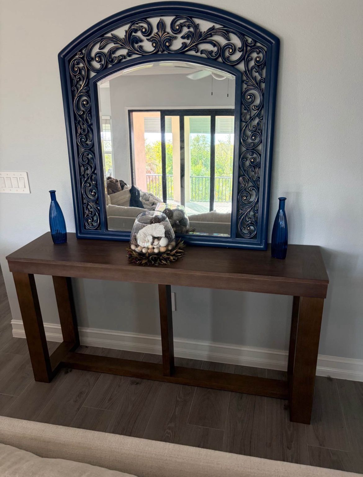 Selling this beautiful entryway or living room setup. Both pieces are in excellent condition and work perfectly together, but I am willing to part them out. Get the complete look! This pairing creates a sophisticated focal point for a foyer, hallway, or behind a sofa. Modern Wood Console Table A sturdy, minimalist console table with a rich espresso/dark walnut finish. Design: Features a clean, Parsons-style frame with a central support beam for added stability. Option 2: Large Ornate Arched Mirror A stunning statement piece featuring a deep navy blue frame with intricate gold-accented scrollwork. Design: Arched top with "fleur-de-lis" style ornate detailing. Color: Navy blue with metallic highlights. Pickup or drop off available Condition: Smoke-free home. Mirror Safety: If someone buys just the mirror, remind them to bring a blanket or bubble wrap for transport, as it is quite large and fragile.