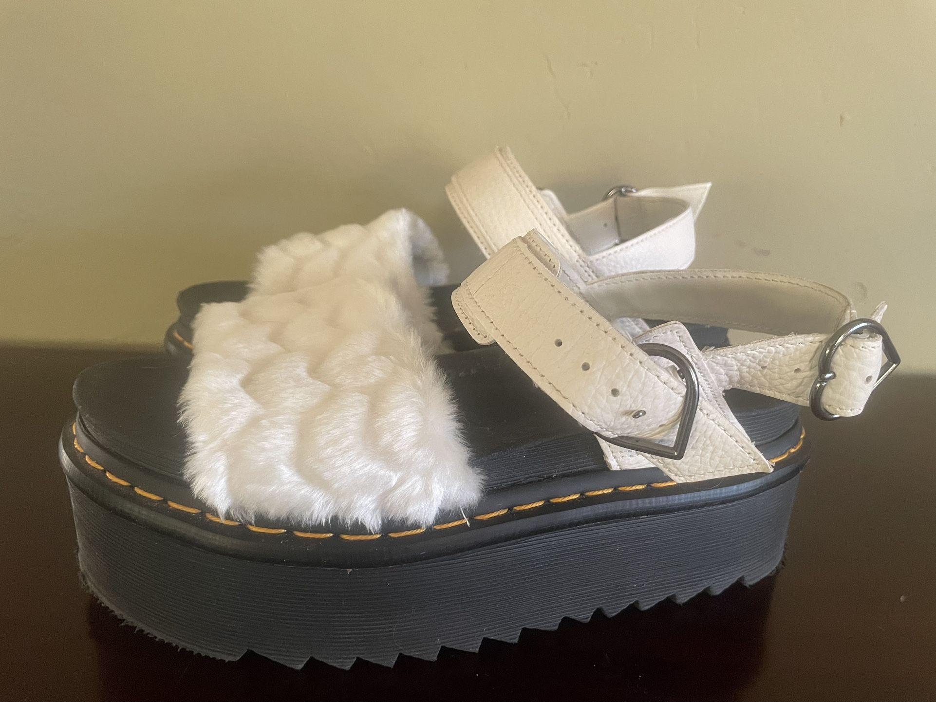 Dr. Martens White Voss Fluffy Faux Fur Platform Sandals