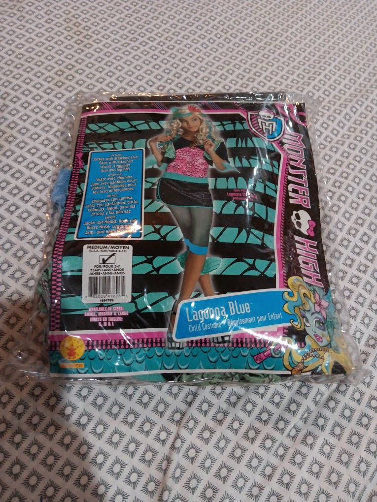 Monster High Lagoona Blue costume and wig Comes with shirt attached to jacket Skirt with attached shorts Leggings and arm fin Note missing leg fin Wig comes with flowers and fin Size 8-10 medium For ages 5-7 Visit my page to view more items Thank you