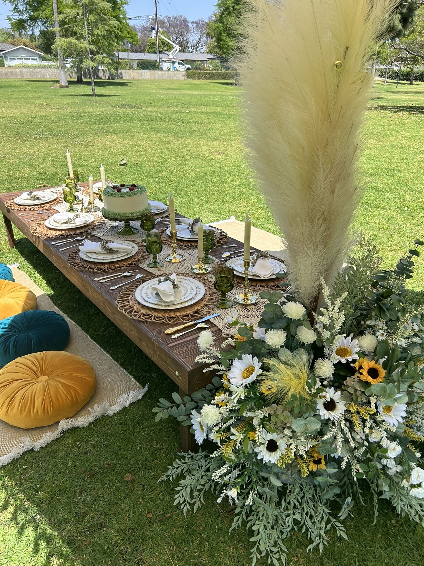 Picnic Table With Plates, Pillows, Umbrella, And Dinnerware