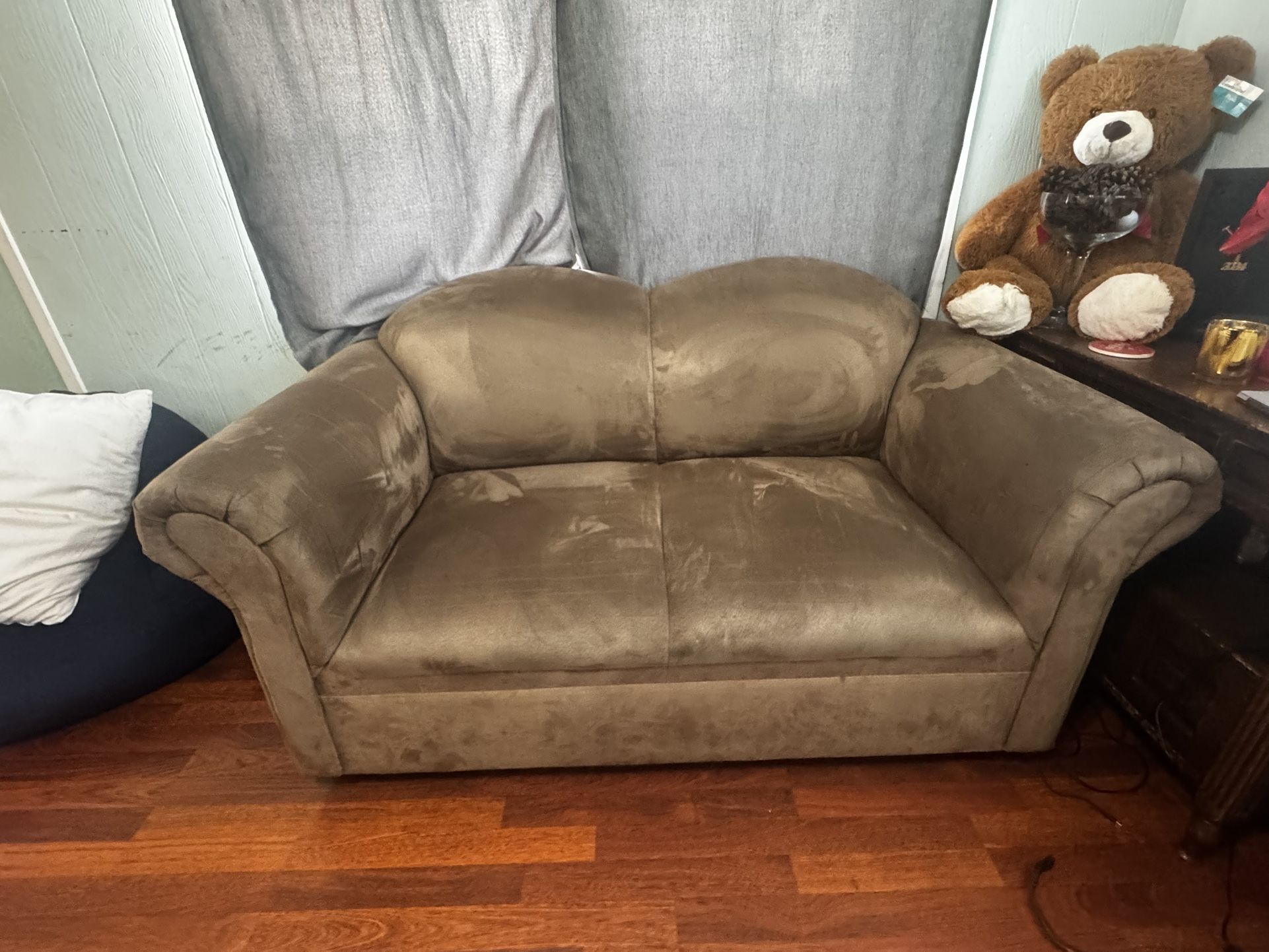Used Loveseat couch, soft sturdy couch Color is a coffee mocha brown, material is like a suede Width: 32 inches Length: 63 inches Height: 26 inches