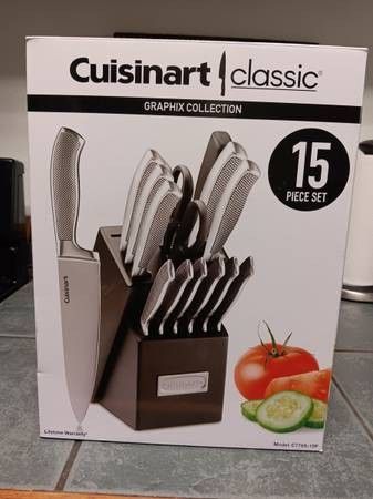 The "Nuts and Bolts" section.... Cuisinart Classic Graphix Collection 15 Piece Knife Block Set. Featuring textured handles and a sleek, modern design, this knife set adds depth and dimension to your food prep tasks. High-carbon stainless steel blades and handles Ergonomic handles offer a comfortable grip Hardwood knife block features a black finish Set includes: 2¾" Bird's beak paring knife 3½" Paring knife 5½" Serrated utility knife 7" Santoku knife 8" Chef’s knife 8" Slicing knife Six 4½" steak knives Shears Sharpener Wood block # Pieces In Set: 15 Included: 1 Knife Sharpener(s) Features: Dishwasher Safe Base Material: 100% Stainless Steel Care: Hand Wash Material: Stainless Steel Click on my profile to check out all the other items I am selling. The "Pricing" section.... $80 All items sold "as is"! Payment for this item is cash or trade ONLY. ****IN PERSON ONLY!!!!**** Unless other advance arrangements are made. The "Contact Info" section.... Please TEXT Dale @ 6ohtwo. fiveohoh. 19oh9. If you do call, please leave a msg, and I will get back to you. Emails are hit and miss. The "Mumbo Jumbo" section.... If this post is still active, the items/materials are still for sale. ALL spammers, scammers, and con-artists need not reply at all as I did not fall off the turnip truck yesterday! I will not fall for your feeble attempts to part me from my hard earned money!****