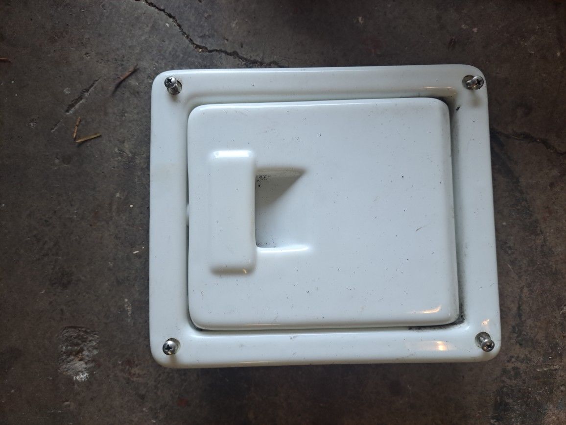 Removed from a 1993 Seaswirl 188 open bow boat. A white plastic pass through door with surrounding trim. Measures 8 3/8" by 7 1/8" (outside trim). Door is 6 1/2" by 5 1/2". Stainless mounting screws included