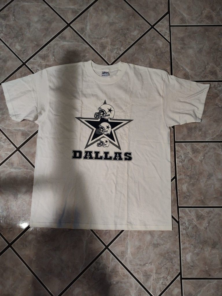 White cotton t-shirt. Features Dallas Cowboys logo with three helmets. Size 2XL text for more information or pictures