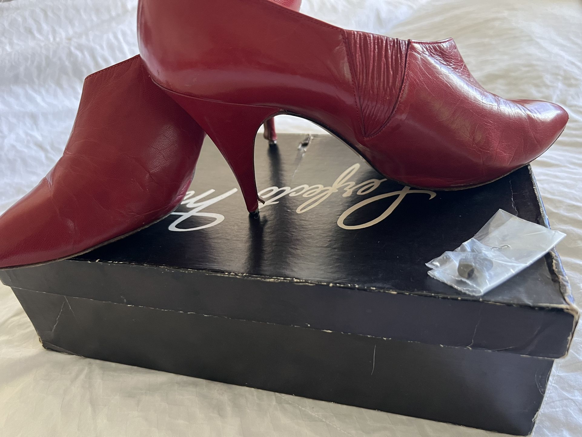 Perfecto Mas designer shoes - Valdepenas 2 pair Size 8-1/2. Red & Black. These are RARE from Spain, soft BABY leather. Conforms to your foot. 3 inch heels. Both come with new replacement heels. 👠 (see picture of bag next to shoes or near box). Take them to a nice shoe cobbler or repair shop & they can twist the replacement heels right on for you if your not incline. A-nice buff wouldn’t hurt either (I recommend the cobbler repair - which is what I did during the years). Only reason I’m parting with them is - when you have kids your feet🦶grow 😕😏. I dont believe in squeezing feet into shoes. Especially these. I got more compliments every time I wore these. Think it’s the asymmetrical design. They are perfect for business & can really rock a nice pair of jeans. They use to be my summertime favorites. They just need an appreciative home. These were bought on an East Coast shoe shopping spree yrs ago. Dated but they are TIMELESS. Prefer to sell as a pair but will sell separate. Red - $30 obo Black - $30 obo Together $55 firm