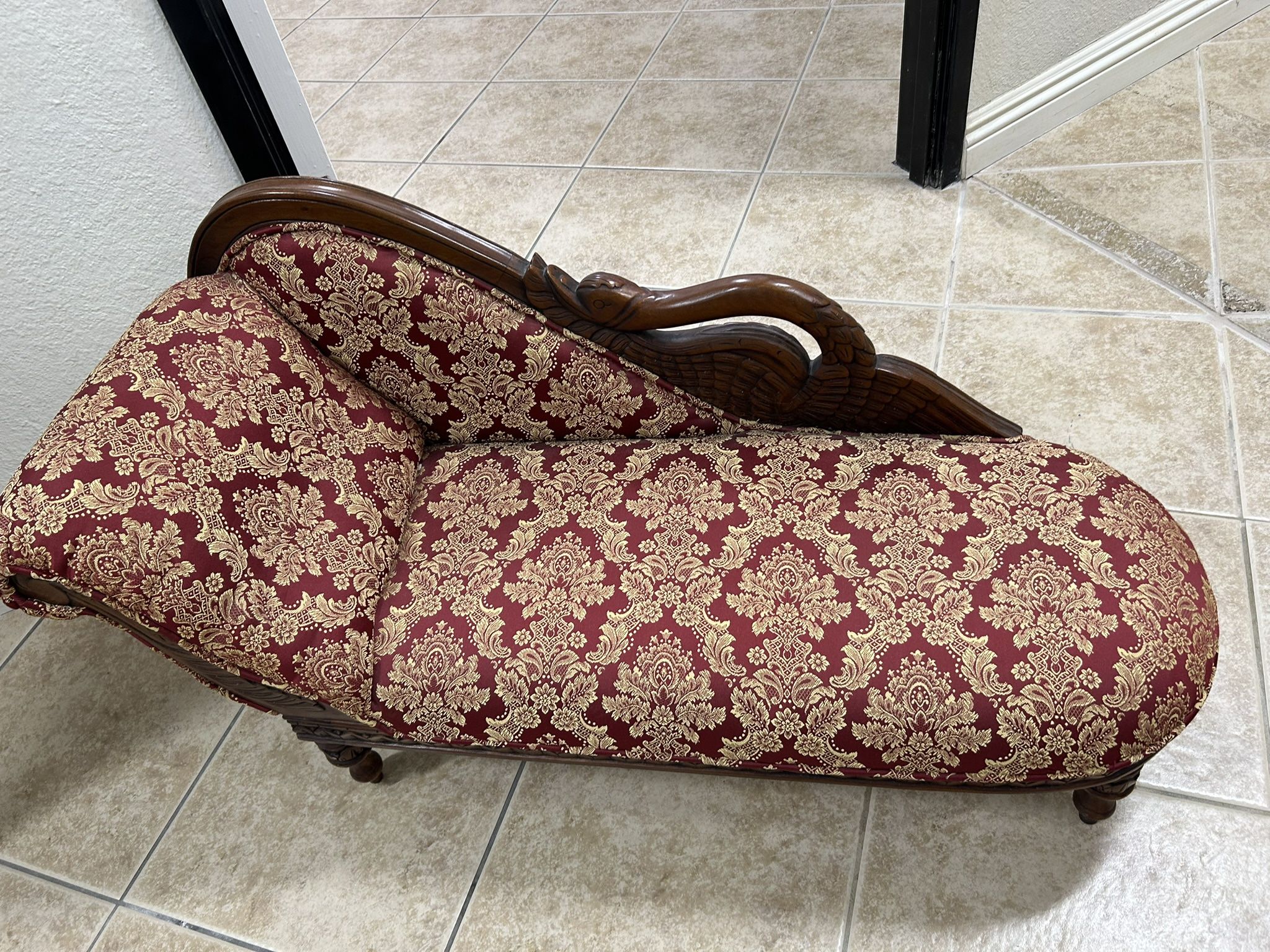 Elegant and classic sofa for small Pet, perfect for pampering and giving your pet a lifestyle living. About 20” wide with a backer. Upholstery red and gold with wood.