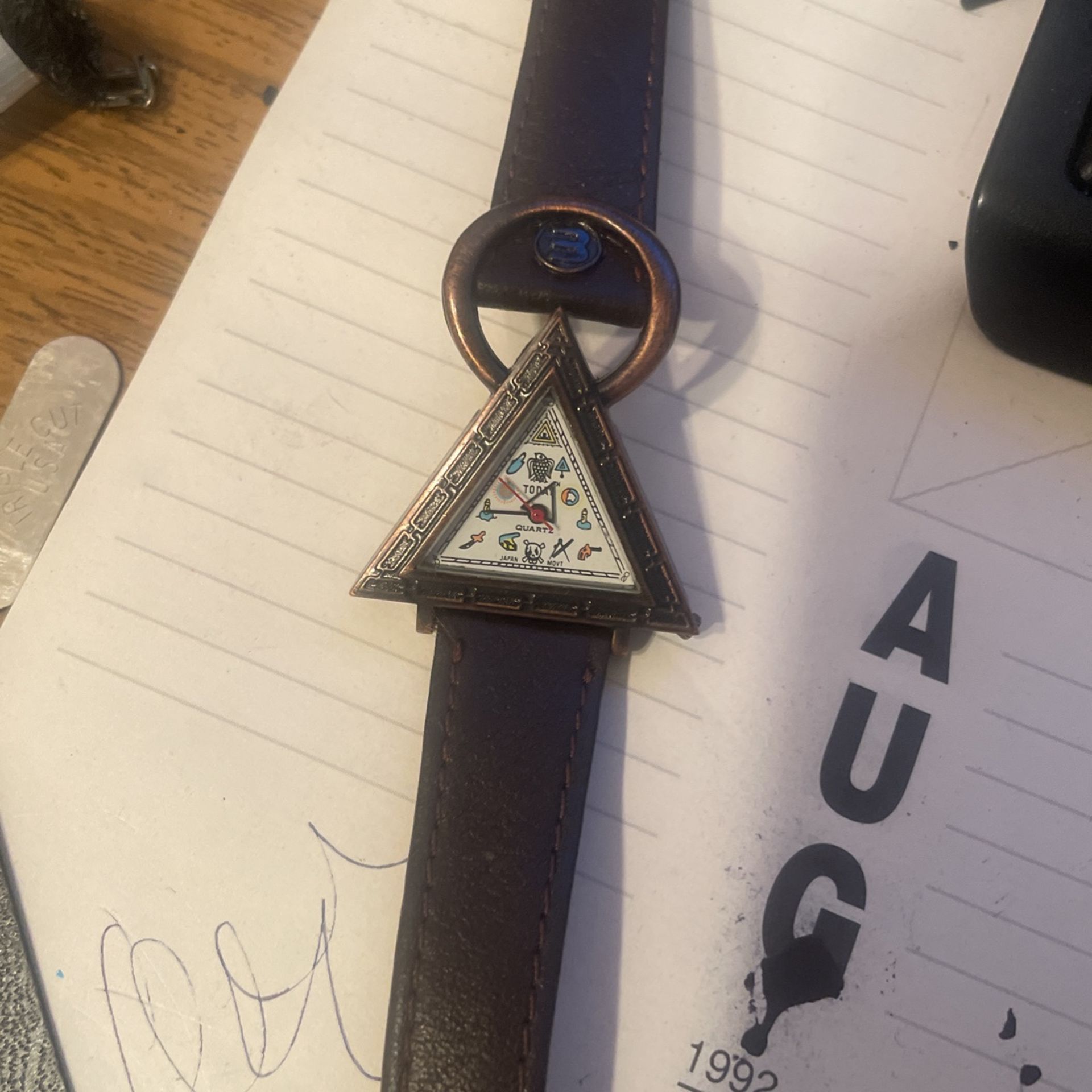 Vintage Triangle Masonic Wrist Watch New Battery – Works Great – Made by Prestige Watches 1 Jewel Quartz Movement – This triangular Masonic watch was made by Prestige Watches in the US, probably around the 1980s. It is a homage to a classic design. The dial is clean and has the masonic symbols as the numbers.