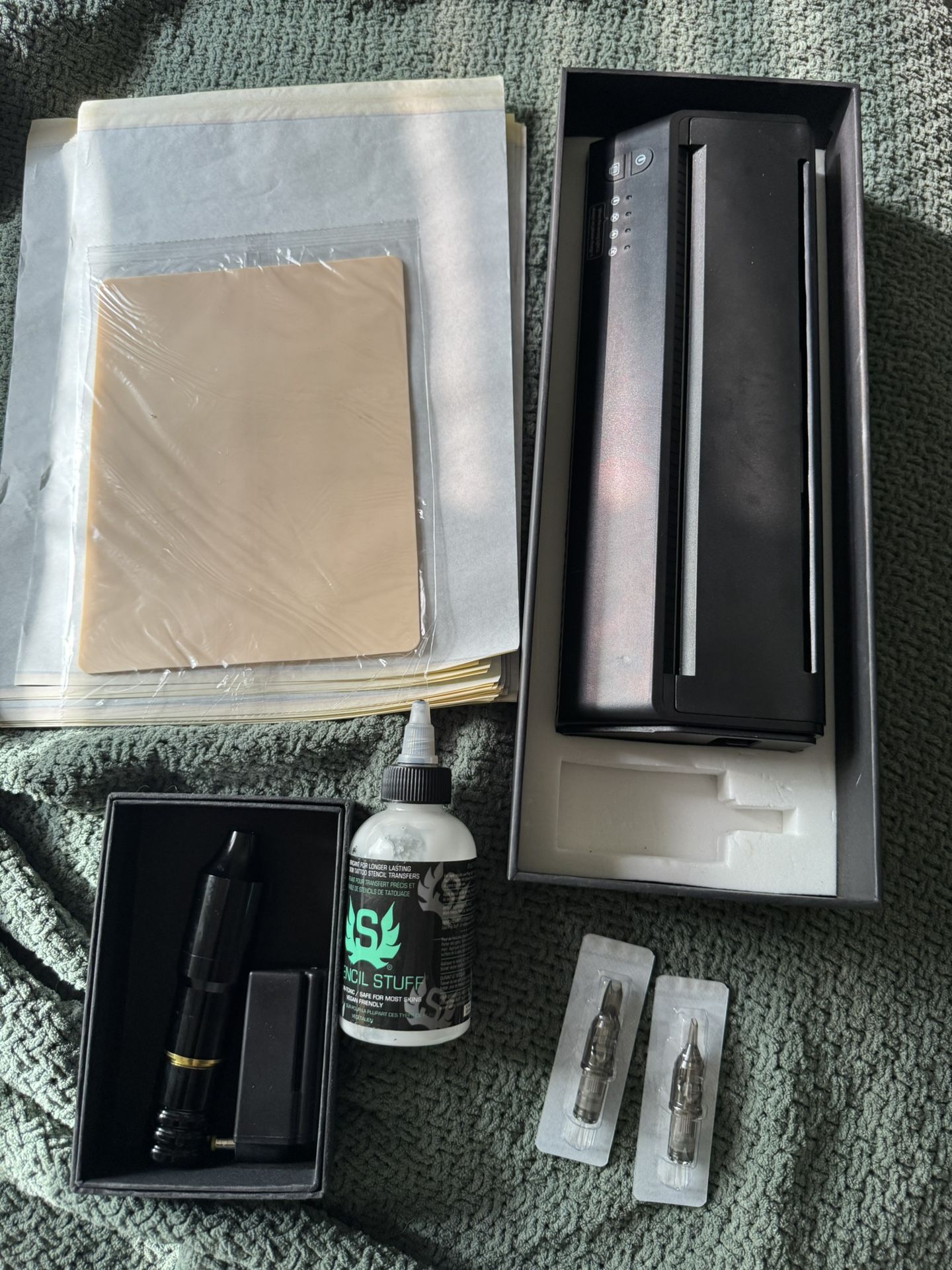$100obo Used a couple times works perfect I just need the money Tattoo gun w/ battery Tattoo printer ❌ 25 transfer papers ❌ 1 practice skin 15 fine line needles 4 shading needles Stencil gel Ink bowls