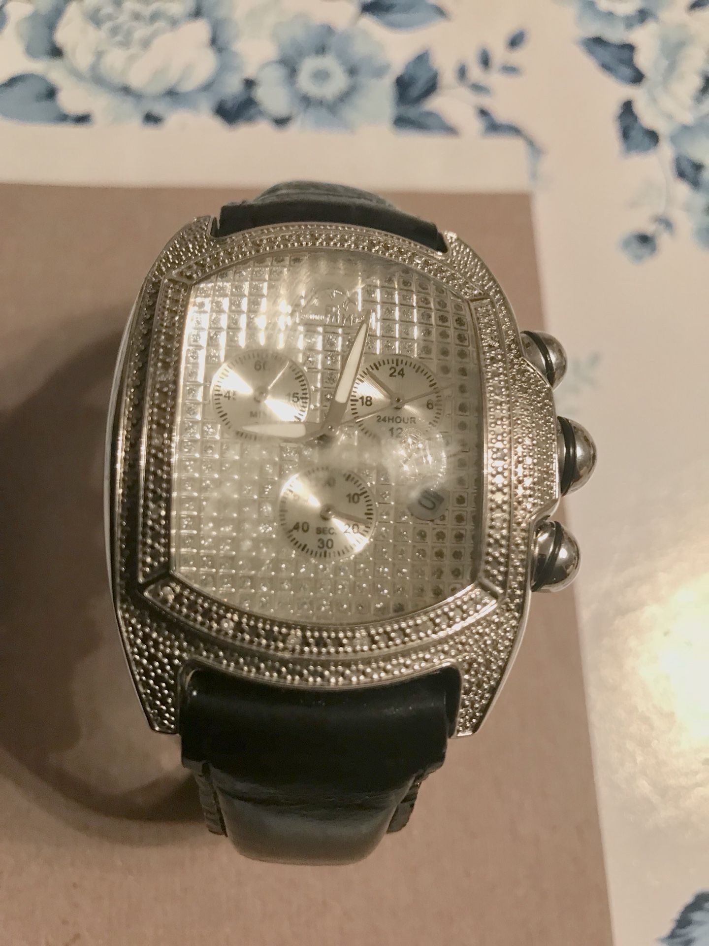 Nice watch with diamond encrusted bubble face and bezel. Also has date. Has new battery and is water resistant. Also has black leather band. Missing one screw on back. Can Easily be replaced by jeweler.