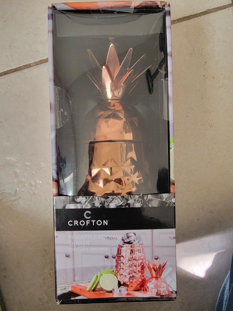 New Crofton pineapple-style cocktail shaker in original packaging. Features a decorative metallic pineapple design that doubles as a functional bar tool. Box is sealed and shows minor shelf wear from storage. Great for home bars, entertaining, or as a stylish gift.