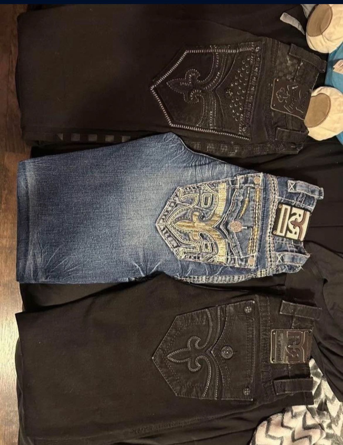 I got 3 pair of rocks that i dont use no more, will trade for possibly a spider hoodies/ bape or stuff like that. Or some purple jeans/stacks lmk or asking $120 each. Black with rinestones are 30x32 limited addition, the regular black ones are 28x32 and so are the blue ones. All in amazing condition or lmk for any trades
