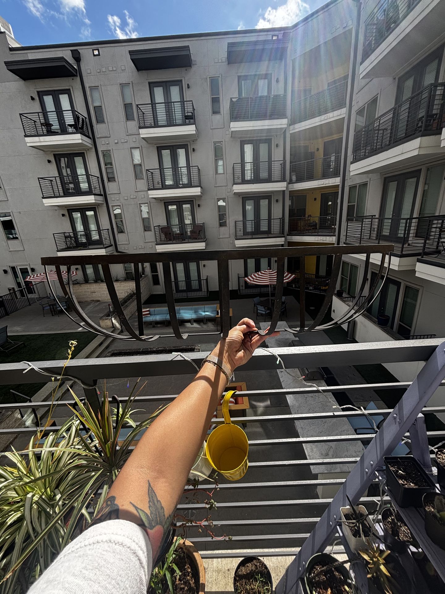 Metal plant hangers, perfect for balconies. Just need brackets and inserts which you can find at Home Depot or Lowe’s. $5
