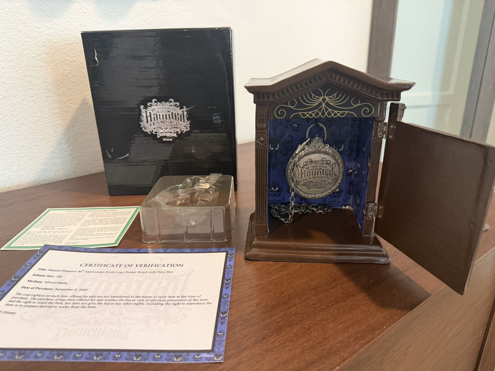 This listing is a Disney Haunted Mansion Pocket Watch from the Haunted Mansion’s 40th Anniversary collection. It comes in its original packaging with its certificate of verification and from a smoke-free home. This rare item had an edition size of only 300 and our price is based on one currently listed on eBay. Never used, but needs a new watch battery due to its release date. Originally $150. Please see photos! SORRY, CASH ONLY PLEASE. Check out our other Disney listings!