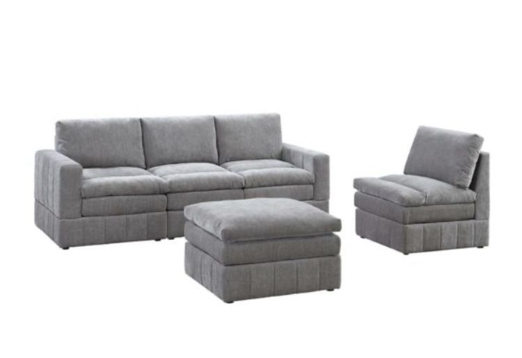 Sofa, Chair and Ottoman Item # 465 Color: Granite Also Available in Mink (Brown) Material: Morgan Fabric Dimensions: Sofa: 92″ x 33″, Chair: 33″ x 26″, Ottoman: 33″ x 26″ Some Assembly Required