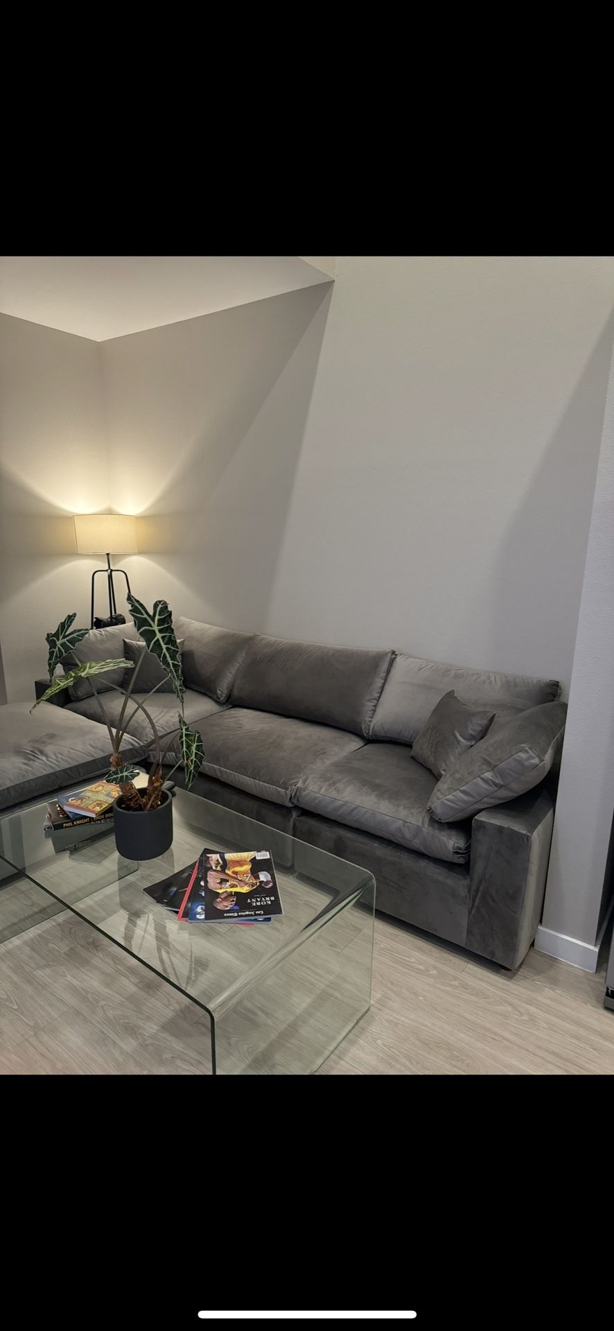 Very lightly used cloud type couch, 116” length all adjustable, custom dark grey upholstery very easy to clean.