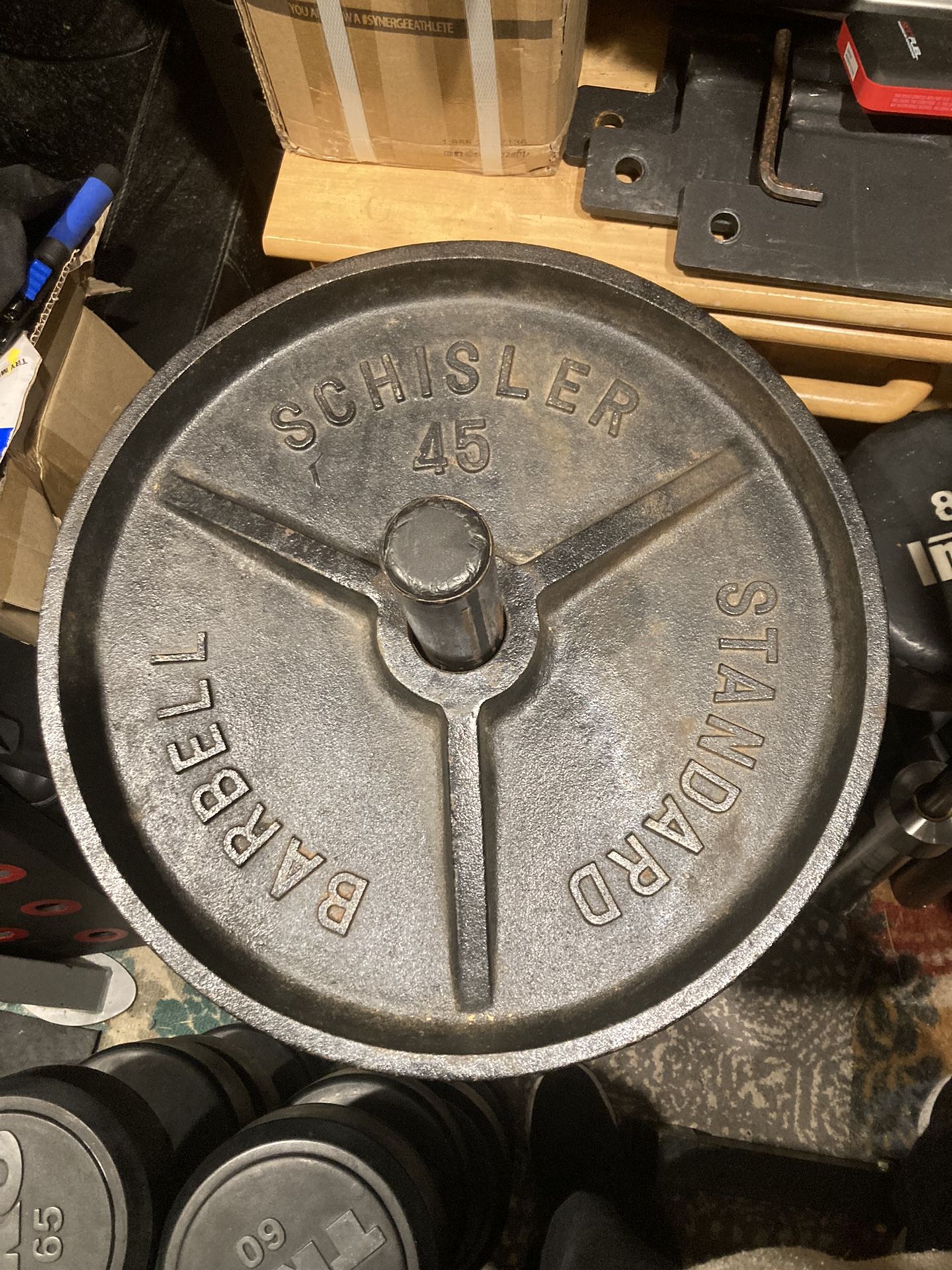 Good condition. See pictures. 2 x 45 (Mismatched Schisler/York) - $100 2 x 35 (Mismatched Sports Authority/Troy) - $75 2 x 35 (Fitness Gear) - $75 2 x 25 (Steel GPI) - $60 2 x 25 (Rubber GP) - $75 Take them all for $325 I can include a 7’ Olympic barbell for an additional cost. Weight storage tree, weight plates, bumper plates, squat rack, adjustable bench press, workout, exercise, training, home gym, Olympic barbell
