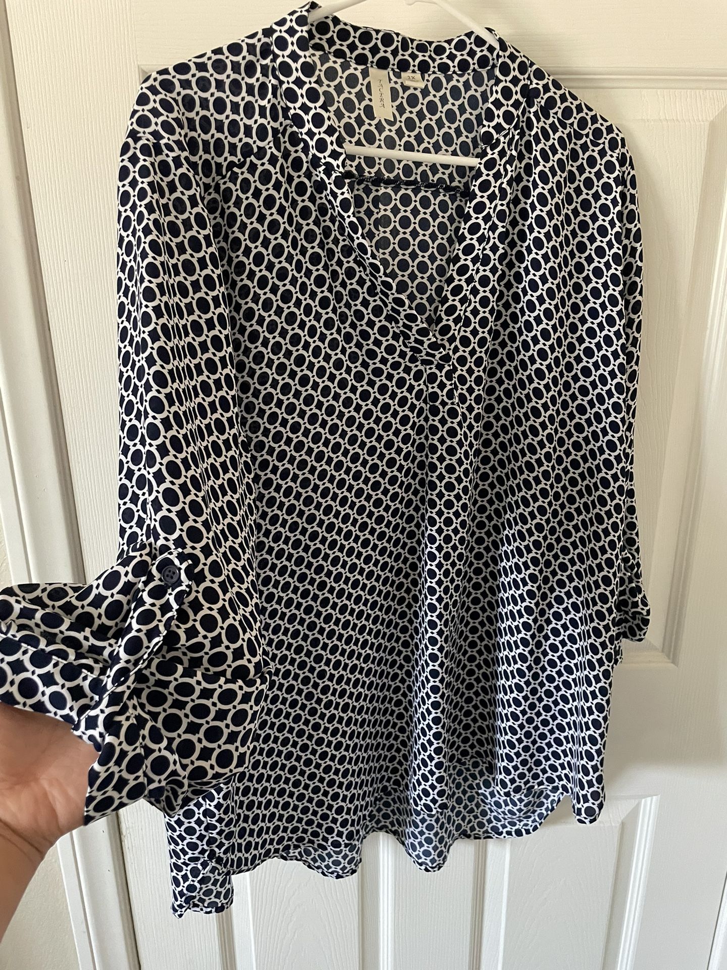 2X blouse featuring a navy and white geometric circle print. Lightweight, flowy fabric that drapes nicely and feels comfortable all day. Designed with a flattering V neckline and relaxed fit that is easy to wear and not tight. Long sleeves with button cuff detail that can be worn down or slightly rolled. Slightly longer length with a smooth, loose drape.